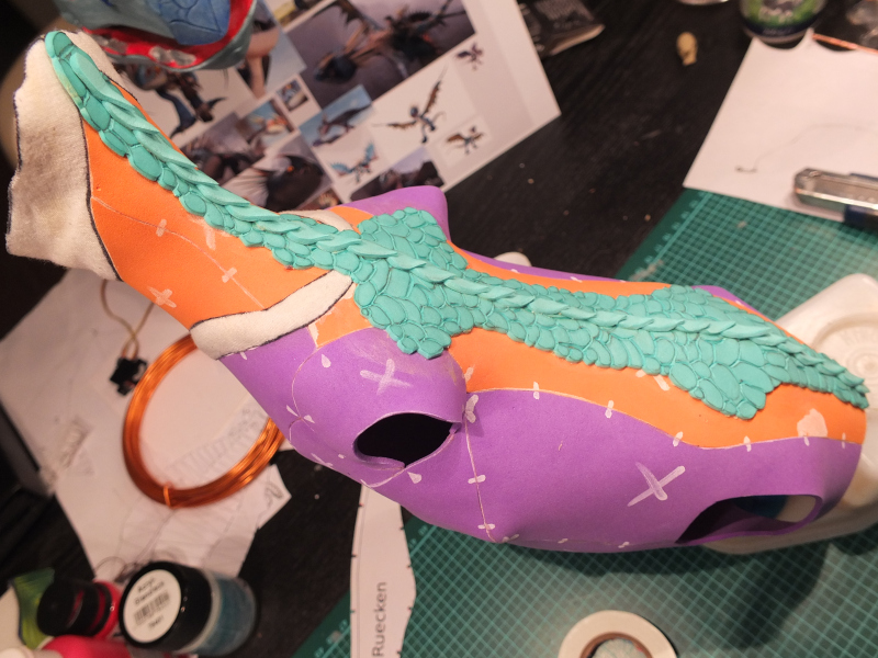 Wieder in Inkscape nachbearbeitet und mit Klebemarkierungen versehen können die Bögen ausgedruckt werden und der Spaß beginnt. Schritt für Schritt werden die einzelnen Teile auf 2 mm Moosgummi übertragen und mit einem scharfen Sklapel ausgeschnitten. An den Kanten stumpf mit Kontaktkleber zusammengeklebt fügt sich nach und nach ein Drachenkörper.