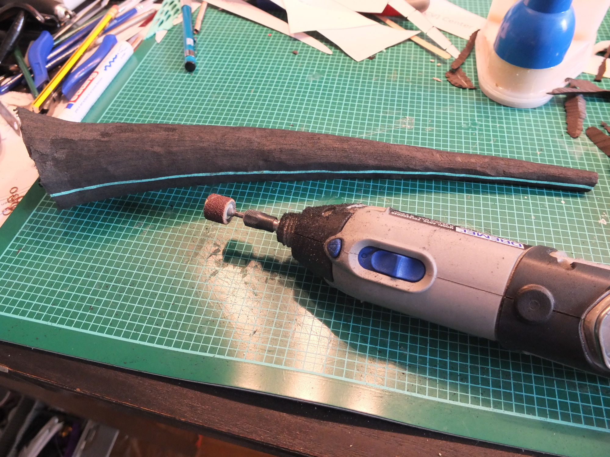 Als die Lagen fest verbunden waren habe ich zuerst mit einem scharfen Messer alles in Form gebracht und anschließend den Dremel ausgepackt.