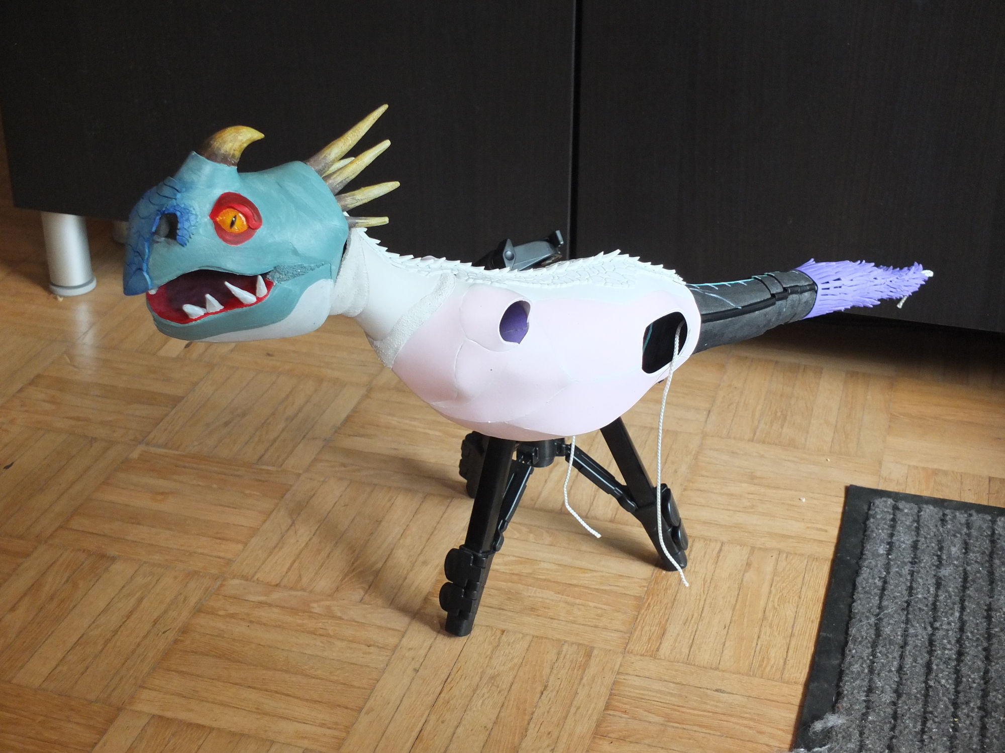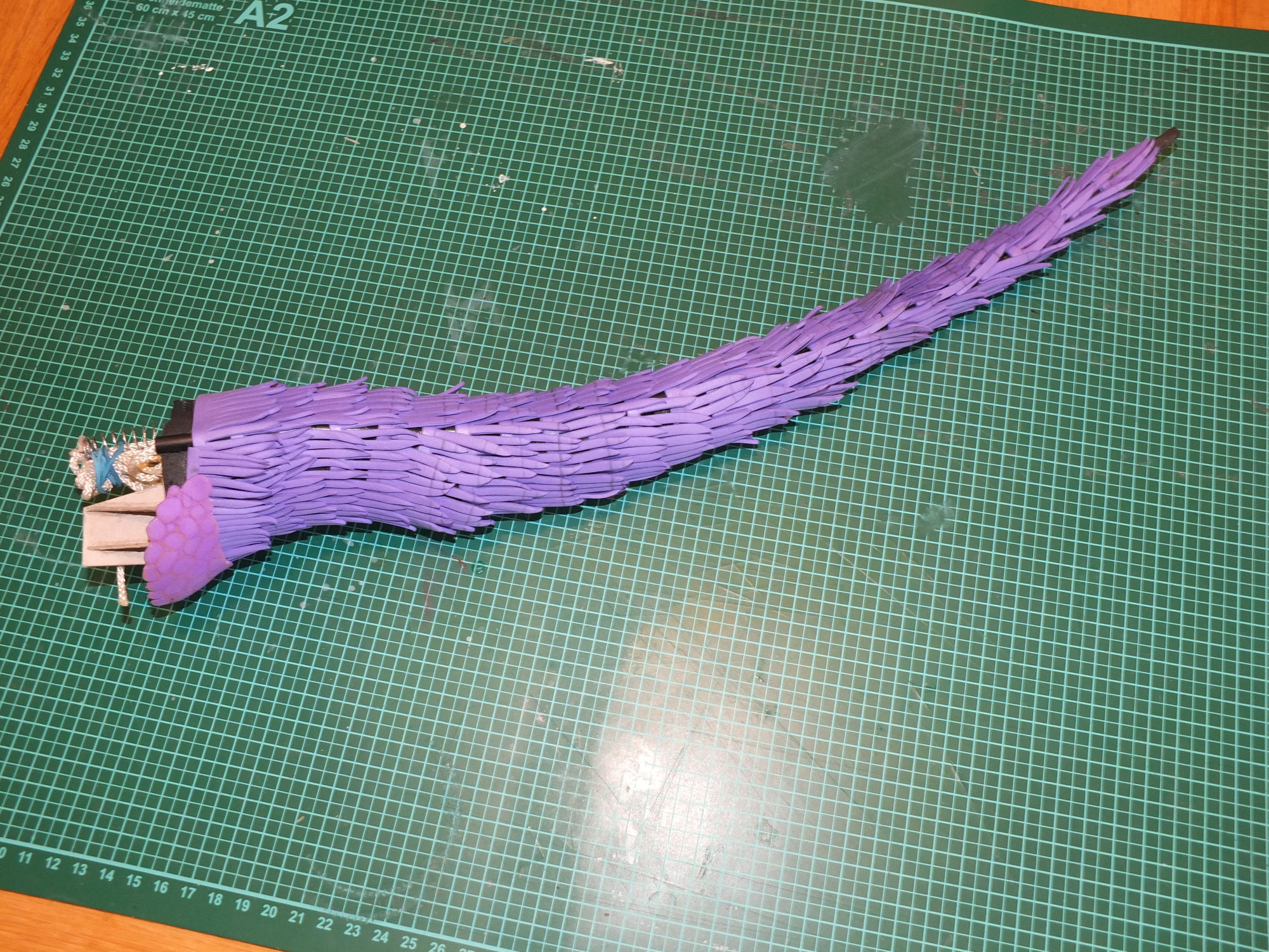 Ich musste also einen Weg finden, den Schwanz zu bewegen. Eine vage Vorstellung hatte ich bereits: Ich wollte den Grundkörper aus Schaumstoff formen, dann in Segmente schneiden und mit Seilen zusammenfügen.