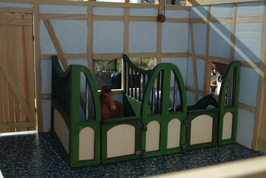 Zum Schluss wurde noch alles verleimt und die Scharniere angeklebt. Meine Nichte hatte ihren Spaß beim Einrichten ihres Pferdestalls.