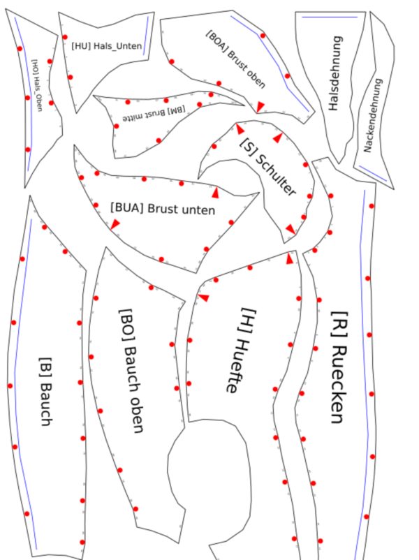 Hals und Körper sind im Modell schon fertig, die Aufteilung in ein Schnittmuster erfolgt nach dem selben Prinzip, wie schon der Kopf. Möglichst große, zusammenhängende Flächen finden, die hauptsächlich nur in einer Richtung gewölbt sind. Ist alles aufgeteilt erfolgt die Abwicklung.