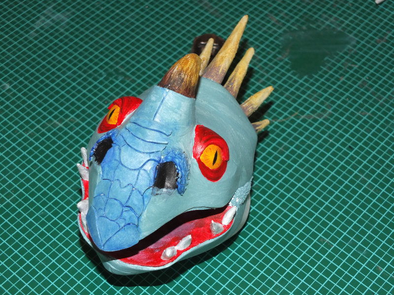 Den Hals habe ich später dann noch komplett aus Trikotstoff gefertigt und nur die Schuppen am Rücken durchgehend aus Schaumstoff gefertigt. Das Moosgummi war einfach zu steif, um eine glaubwürdig und fließende Bewegung zu ermöglichen.