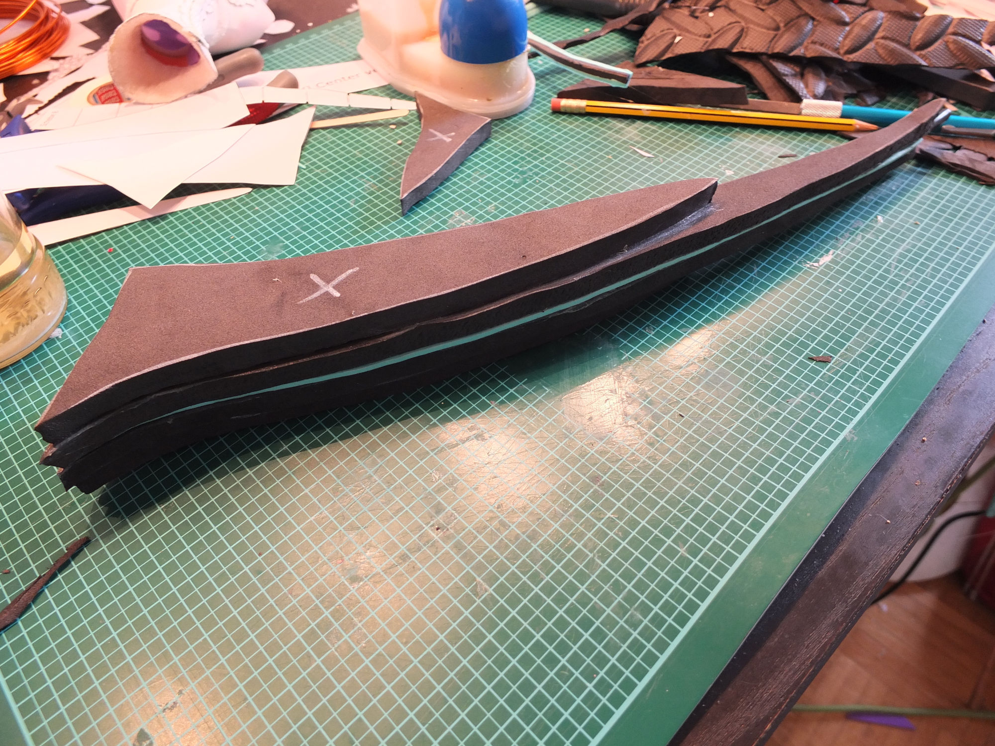 Ich habe also angefangen, eine grobe Form aus mehreren Lagen Schaumstoff aufzubauen. In die mittlere Lage habe ich gleich ein dünnes Rohr aus Kunststoff eingesetzt, das eigentlich für Bewässerungssysteme hergestellt wurde, das soll dann später als Rückgrat dienen.