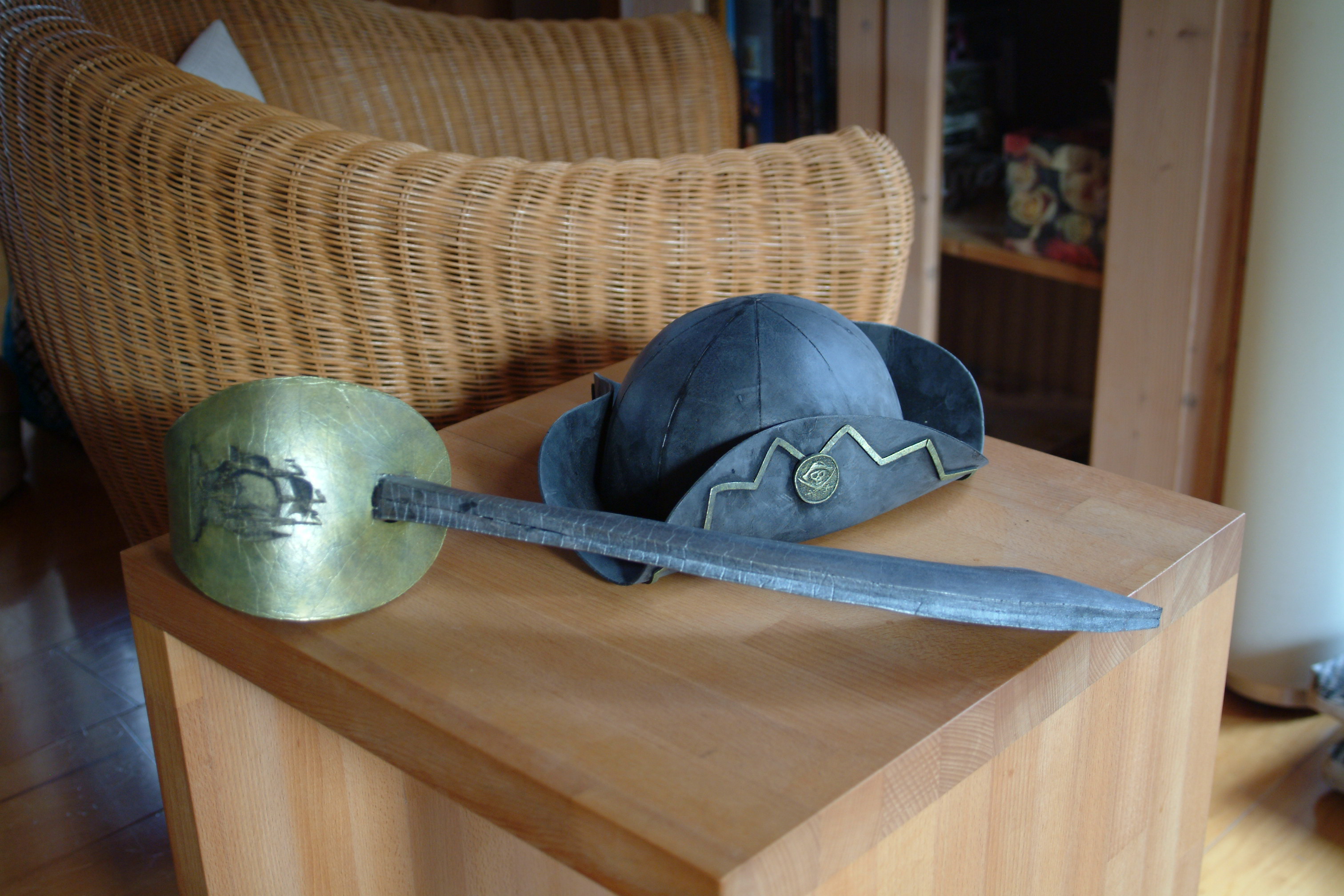 Alles wurde schwarz grundiert und dann mit Silber und Gold detailiert. Am Hut wurden die Zierstreifen und das Medallion golden bemalt. Die Klinge des Säbels wurde Silber, der Handschutz erhielt eine goldenen Überzug. Um das gravierte Segelschiff hervorzuheben wurde alles mit sehr verdünnter schwarzer Farbe dreckig gemacht. Den Griff des Säbels habe ich mit einem braunen Streifen Moosgummi umwickelt, der dann mit Farbe eine Lederoptik erhalten hat.