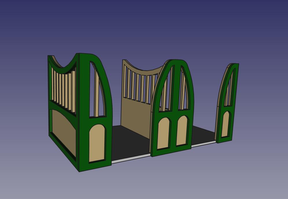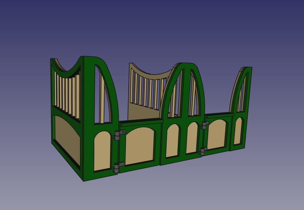 Mittlerweile hatte ich einige Erfahrung mit FreeCAD und machte mich an die Konstruktion. Natürlich hat die Methode mit der Zeichnung in 2D für den Stall hervorragend funktioniert, konstruiert man allerdings gleich in 3 Dimensionen fällt es leichter, die Materialstärke einzubeziehen und man kann komplexere Formen ineinander übergehen lassen.